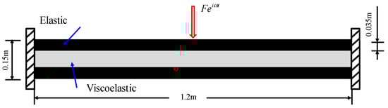 In this section, we take a sandwich beam shown in Figure 2 as an example to study these two methods. The size of the beam is 1.2 m × 0.15 m and the left and right sides are fixed. Two materials are used in this structure: the upper and lower layers are filled with elastic material and the core is the viscoelastic material, which has a high damping ratio. The material properties of the two materials are listed in Table 1. An exciting force is applied in the middle of the upper line with a frequency band [0, 5000] Hz. Here, we discretize the frequency band into 1001 frequency points uniformly for solving the state equation.