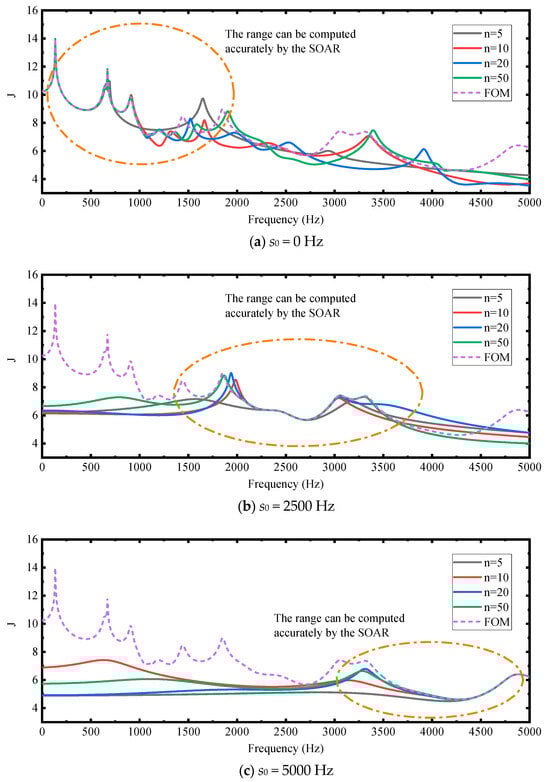 The response curves of the SOAR with different numbers of basis vectors and different positions of expansion points: (a) s0 = 0; (b) s0 = 2500; (c) s0 = 5000.