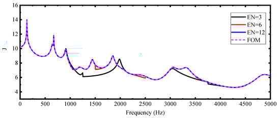 Inspired by the conclusions above, we tried to add more uniformly distributed expansion points (the number of the expansion points is EN) in the frequency band. Since the number of the basis vectors plays a small role in the computational accuracy, ten basis vectors are used for each point. Figure 4 shows the frequency response curves for the SOAR with EN = 3, 6, and 12 expansion points. Obviously, more expansion points will give more accurate results. The blue curve is computed by 12 expansion points and is nearly coincident with the curve obtained by the FOM. Nevertheless, we do not know how many expansion points are needed for a specified problem. Using too many expansion points will waste computational resources.