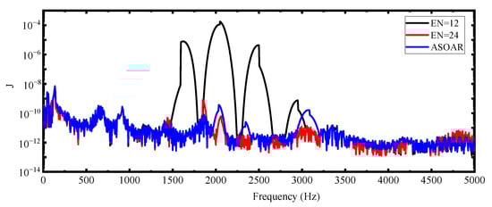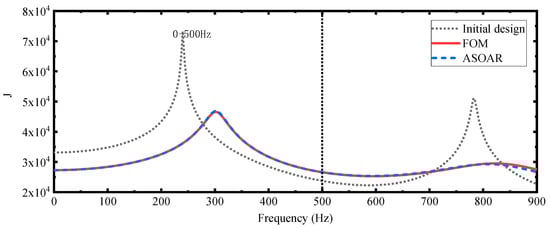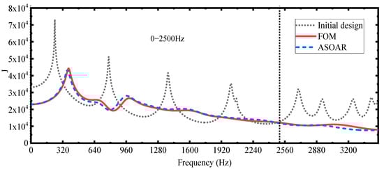 Then, we consider another frequency band [0, 2500] Hz, which is discretized into 1001 frequency points. The optimized results for different methods are shown in Figure 11. The first result is obtained by the FOM and used as a reference and the other results are obtained by the ASOAR (EN = 7 in the optimized result). The frequency curves for the initial design and the optimized designs obtained by the FOM and the ASOAR are shown in Figure 11. The objective values of the optimized results obtained by the FOM and ASOAR are 5.842 × 104 and 5.798 × 104, respectively. For the results obtained by the ASOAR, we used the FOM to compute the objective values and they remain unchanged. The frequency curves for the initial design and the optimized designs by the FOM and the ASOAR are shown in Figure 12.