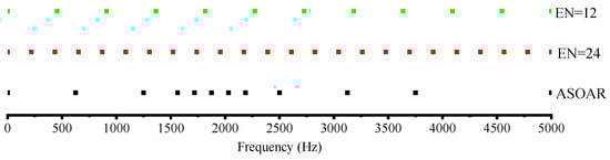 For the same example described in the above subsection, we use the ASOAR proposed in this paper to solve it. = 0.01 is employed here and the ASOAR results in 12 expansion points. Figure 5 denotes the relative errors of the results obtained by the SOAR with uniform distributions of expansion points and the ASOAR. The relative error of the ASOAR is significantly lower than that of the SOAR with EN = 12 and is similar to that of the SOAR with EN = 24. This is reasonable and shows the effectiveness of the proposed method. The distributions of the expansion points in the frequency band are shown in Figure 6. Compared to the distribution of the uniform distribution, the ASOAR puts more points in frequency band [1500, 2500] Hz. This is also the reason why the accuracy of the SOAR with EN = 12 is low within this range. The time cost of different methods is shown in Table 2. It can be seen from the table that although increasing the number of expansion points can improve the accuracy, the time cost it brings also doubles. Therefore, the ASOAR proposed in this paper can effectively avoid the computational cost caused by blindly increasing the expansion points.