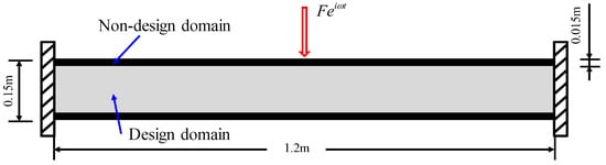 In this section, numerical examples are shown here to verify the effectiveness of the proposed ASOAR method. The example considered in this paper is a two-dimensional beam, whose design domain and boundary conditions are shown in Figure 7. The size of the design domain is 1.2 m × 0.15 m and the left and right sides are fixed. A harmonically varying force of magnitude 1000 KN is vertically applied in the middle of the top line. Since this example is symmetric, half of the domain is used for analysis and the symmetric boundary condition is imposed. Then, 120 × 30 four-nodes bilinear square elements are used to discretize the domain and the three-element layers in the top and bottom domain are set as non-design domain, which remains elastic material in the optimization process. The volume fraction of the elastic material in the optimization model is set as . The initial values of the design variables are set to be equal to the volume fraction . The filtering radius is and the threshold is . All the optimization problems are solved using the gradient driven MMA algorithm. The convergence criterion is chosen as and the maximum iteration number is 400. The material properties used in all examples are listed in Table 1. For all examples, the code was implemented by MATLAB R2024a. The used computer has two Intel(R) Xeon(R) Gold 6126 CPU @ 2.60 GHz and the memory is 256 GB (Intel, Santa Clara, CA, USA). No parallel computing was used for all examples.