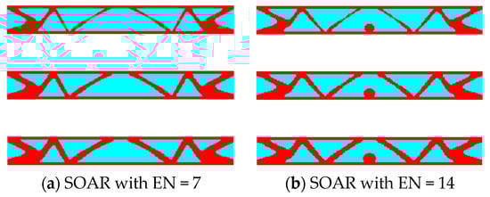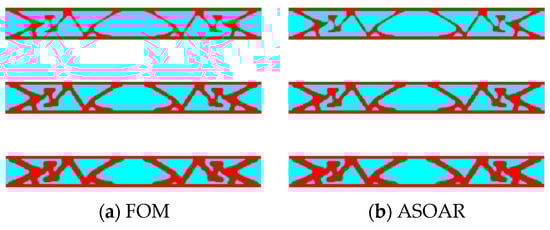 Furthermore, the SOAR with EN = 7 and EN = 14 are applied to the above topology optimization design and the optimized designs are shown in Figure 15. The four optimized results are not the same but have similar topology and objective values. This is because, for the high frequency, the optimization problem is not stable. Even a tiny numerical error causes different results. The time costs and the objective values of the results are given in Table 4. The objective functions of the four schemes are similar. In terms of time costs, although the number of expansion points of the ASOAR and the SOAR with EN = 7 in the final optimization result is the same, the number of expansion points required in the early stage of optimization is less than seven, which leads to less time consumption for the ASOAR. The time-saving effects of the ASOAR with respect to the FOM and the SOAR with EN = 14 are 94.05% and 53.37%, respectively.