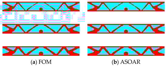 First, we consider that the frequency band of the force excitation is [0, 500] Hz and it is uniformly discretized into 251 frequency points. Thus, the state equation and adjoint equation should be solved 251 times. In this case, the force excitation is low frequency, near the first-order natural frequency, and 10 basis vectors are used for the ASOAR. The optimized results obtained by the FOM and the ASOAR are shown in Figure 8. The red part denotes the elastic material and the cyan part denotes the viscoelastic material. The optimized results obtained by the ASOAR are nearly the same as that of the FOM. The frequency curves for the initial design and the optimized designs by the FOM and the ASOAR are shown in Figure 9. Note that all the curves are computed by the FOM. Only a slight difference exists for the results obtained by the FOM and the ASOAR.