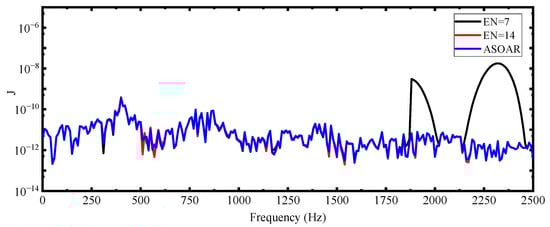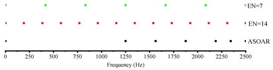 To verify the effectiveness of the proposed ASOAR, the SOAR with different numbers of expansion points is used for comparison. Since the number of expansion points required in the SOAR cannot be directly determined, we solved the frequency response of the optimized design obtained by the FOM using the SOAR with EN = 7 and EN = 14. The relative error curves and the distribution of the expansion points are shown in Figure 13 and Figure 14, respectively. It can be seen from the figure that the SOAR with EN = 7 has relatively large errors in the high-frequency band. While in the ASOAR, the expansion points are concentrated in the high-frequency range, effectively reducing the error, although the number of expansion points of both is the same. The SOAR with EN = 14 increases expansion points and thereby compensates for high-frequency errors. That is to say, the ASOAR (EN = 7) produces same level of epsilon as the SOAR with EN = 14.