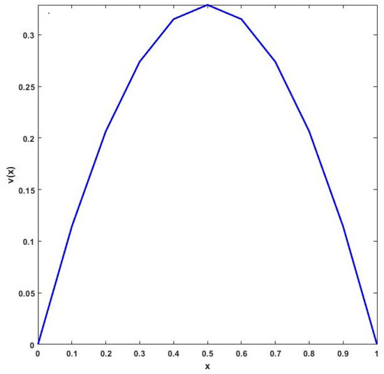 Let , , and . To solve the system (Steps 1, 2, and 3 in the iterative scheme), the MATLAB R2024b routine linsolve, which uses LU factorization with partial pivoting, is employed. Figure 1 plots the numerical solution.