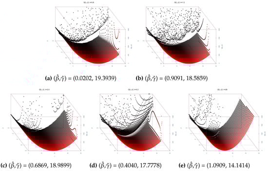 Estimation surfaces for and under a data-generating process with and for five values of : (a) , (b) , (c) , (d) , and (e) .