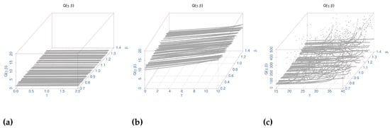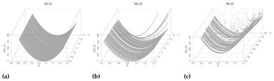 To reinforce the robustness analysis, I expand the study to a denser grid of parameter values. The previous experiment examined only five discrete bundles, but the next step varies each parameter in small increments across a wider range. Figure 3 presents the surface for when is fixed at its data-generating value. The surface is plotted for , and 29, with taking 100 evenly spaced values within the intervals , , and , respectively. Each value of in these intervals defines a distinct parameter bundle for generating the asset-return data, and each curve in the figure shows the objective function as varies with held at its data-generating value. In most cases, the surface remains concave, attaining its minimum close to the true . Instability becomes apparent only when exceeds approximately 9.5. Relative to the surfaces obtained for , the estimation of exhibits greater robustness, evidenced by consistently stable concavity and markedly smaller bias.