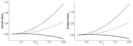 In this part, I use the generated data of consumption and dividend growth rates and asset returns to estimate important parameters and change of measure using the sieve asset pricing model. The summarized statistics for consumption and dividend growth rates are shown in Table 1. It lists the information of the Monte Carlo simulation using 500 draws of 400 observations from an annual data-generating process. The dividend growth rate and consumption growth rate are generated following the DGP discussed in Section 2.2.3. The represented mean estimate, variance, and covariance are listed. The Mean Point Estimate of the intercept is close to the population values in (17). The number values in the variance–covariance matrix are close to the ones in the population. The estimated coefficients for dividend and consumption growth rates are also close to their population values. By setting up different values of , , and and using the consumption and dividend growth rate data, I can generate multiple economies which can give us different asset pricing data. The summarized statistics of asset returns and the mean equity premium in Monte Carlo simulation are shown in Table 2. From the replicated data-generating process, the mean estimates of asset returns are increasing when either or increases. This increasing trend is consistent with Smith [6], while the equity premium is smaller than or close to when and are small. This result is consistent with Weil [25]. When takes the extreme value , the equity premium is larger than . The standard deviations of asset returns with different pairs of values are close to Smith [6].