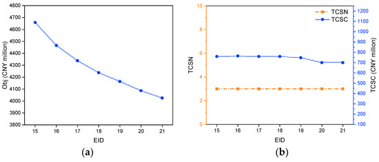 Optimal results of the MIP model with different sailing time ratio (EID: 15–21). (a) Obj of instances. (b) TCSN and TCSC of instances. (c) AUR of instances. (d) ADD and PDS of instances.