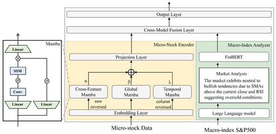 Encouraging progress in state-space models (SSMs), particularly the Mamba architecture, has begun to address these constraints by leveraging hardware-friendly state representations that improve efficiency on long-sequence tasks [12,13,14]. Recent research has applied advanced neural architectures to capture temporal dependencies in micro-level stock data, including the development of Mamba-based models such as MambaStock and S-Mamba [15]. These models exploit the linear state-space modeling power of Mamba to efficiently handle long-range dependencies and outperform traditional Transformer and Long Short-Term Memory (LSTM) architectures in many time series forecasting tasks. However, existing Mamba-based approaches primarily focus on micro-level signals and fail to integrate macro-level, text-driven market information, leading to a partial view of the market’s driving forces.