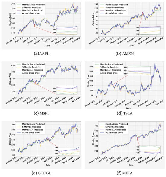 Third, the role of LLM in parsing unstructured macroeconomic data complements Mamba’s structured time series modeling, providing a robust solution to the “heterogeneous data gap” in financial forecasting. As shown in Figure 4, the MambaLLM forecasts continue to closely match ground truth prices even during the volatile period from late 2024 to early 2025, during which the baseline model exhibits significant lags or overshoots. This suggests that the embedding of the LLM encapsulates the underlying relationship between macro-index movements and the behavior of individual stocks, which is not captured by conventional models. Furthermore, the enlarged inset in Figure 5 demonstrates the ability of the MambaLLM to refine predictions on both macro and micro time scales, a capability that is critical for high-frequency trading strategies.