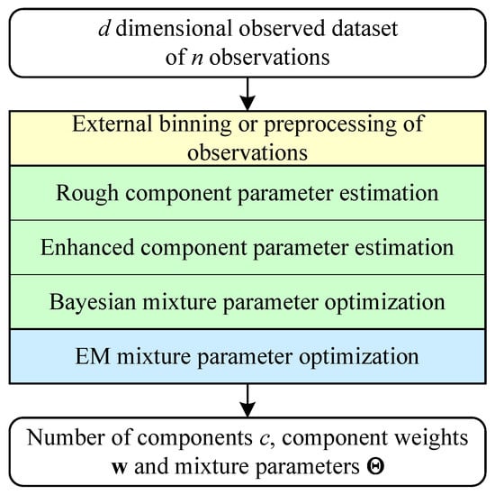 However, a major disadvantage of rebmix was its lower accuracy, as indicated by higher values for the information criteria, where other packages performed better. To address this limitation, an EM step was incorporated [] to fine-tune the FMM parameters. Although this improvement reduced computational speed, it enhanced accuracy. The effects of the latest improvements to the package are demonstrated below. The computational procedure for obtaining the results presented in this section and for further analysis is shown in Figure 6.