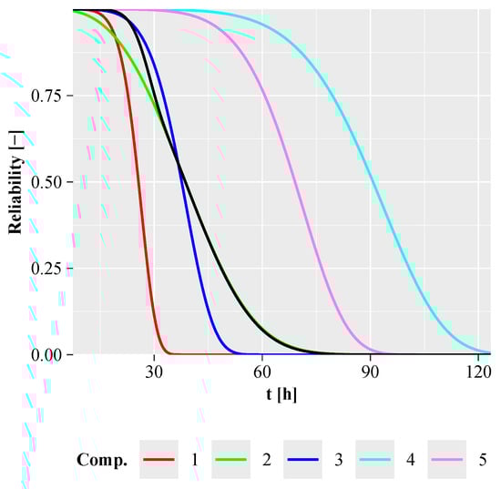 Figure 4 illustrates the time-to-failure probability densities for components 1 to 5, which are colour-coded as follows: Component 1 in red, 2 in green, 3 in blue, 4 in cyan and 5 in purple. The components have significantly different times to failure. The exact time-to-failure probability density of the system, shown in black, shows two different modes. The first mode lies between the modes of components 1 and 3, while the second mode closely matches the mode of component 2. Figure 5 also shows that components 4 and 5 do not contribute significantly to the reliability of the system.