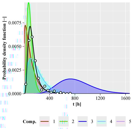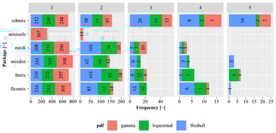 The effect of packages on different parametric families was analysed based on the estimated optimal number of components. As shown in Figure 7, the FMM in the case of mixdist includes only one component in 796 out of 960 cases (). This indicates that, although the systems may consist of up to five components, a single-component FMM is sufficient to reliably represent the system in of cases, despite the variability in component time-to-failure probability densities shown in Figure 8 and Figure 9. Two components were required in of cases, three components in , four components in and five components in only of cases.