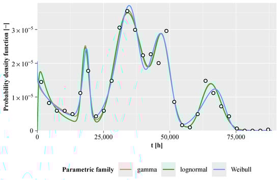 Despite significant progress, the development of a suitable parameter estimation algorithm for different FMMs remains elusive. Research on normal FMMs, where the normal parametric family serves as the component distribution, is abundant and includes well-established parameter estimation algorithms along with software implementations []. In contrast, similar studies addressing FMMs with alternative parametric families, such as lognormal, gamma, or Weibull, are lacking, likely due to their limited use and the practical difficulties associated with their derivation and implementation [,,]. Nonetheless, these parametric families are particularly relevant in reliability analysis, as they often provide a better fit for modelling the time-to-failure distributions of system components [,,,]. Furthermore, readily available software implementations of these FMMs are often lacking or, at the very least, remain unknown to the wider public. Addressing this gap is essential for the wider adoption of FMMs in practical reliability studies, particularly where the flexibility to incorporate diverse parametric families as component distributions is critical for accurately capturing system behaviour.