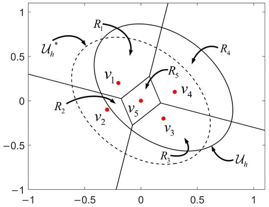 Illustration for relationship between and , and the optimal space corresponding to each discrete control vector with , . The solid and dashed ellipses correspond to and , respectively.