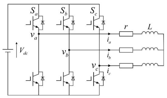 Two-level inverter topology. The arrows indicate the reference directions of phase currents , and .