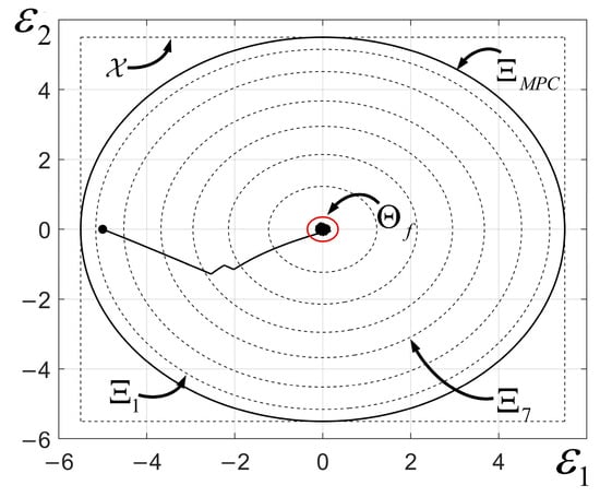 From the discussion in Section 4.1, it can be concluded that the domain of attraction represents the region within which the system stability is guaranteed. If the initial state error belongs to , the error trajectory will converge to and remain within in this process. Otherwise, it may diverge.