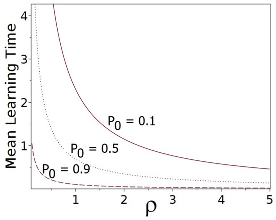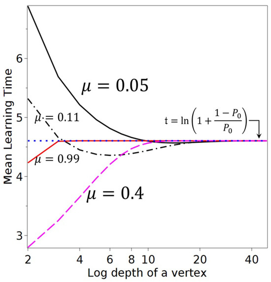 Mean learning time versus vertex depth k in a chain with a fully obstinate teacher () and uniform initial beliefs . Each curve corresponds to a different obstinacy parameter .