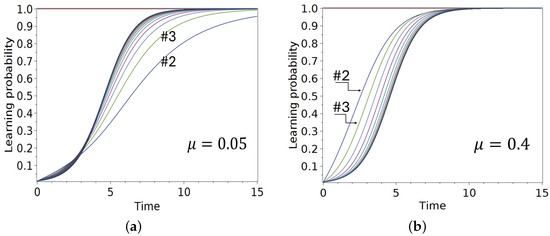Figure 4 presents representative belief trajectories under two regimes; Panel (a) illustrates the weakly autonomous case , dominated by neighbor influence, while Panel (b) corresponds to a balanced regime , where internal conviction begins to contribute appreciably. In both settings, the teacher remains fixed at full belief , while learners evolve gradually under logistic propagation.