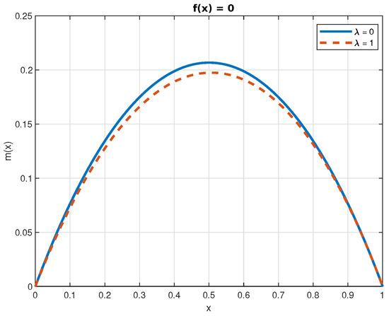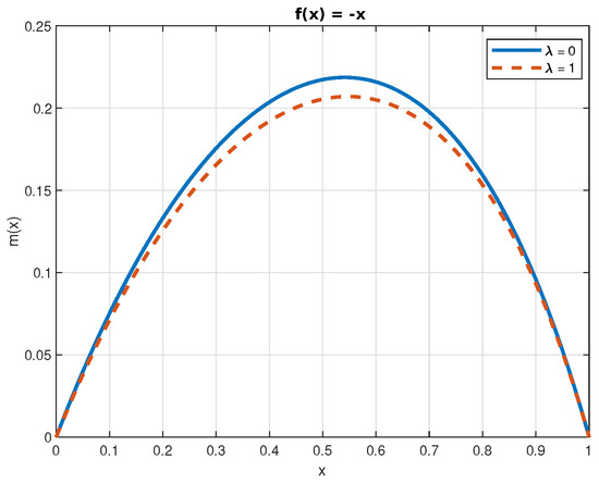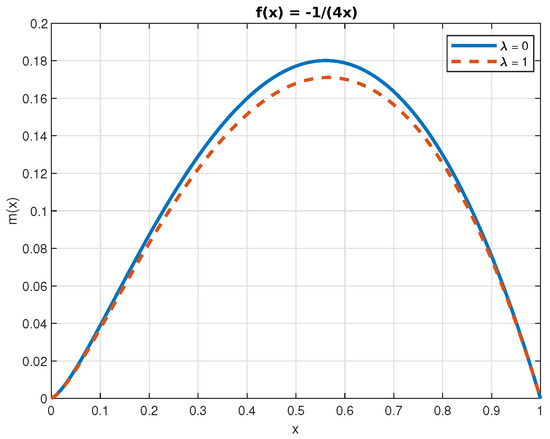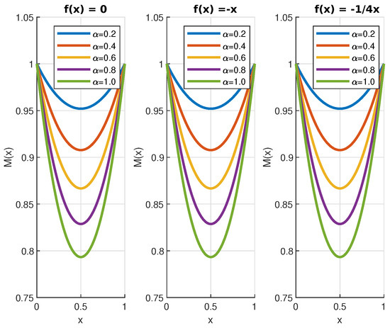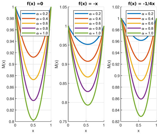 The numerical solutions of Equations (50) and (52) are displayed in Figure 4, Figure 5, Figure 6, Figure 7 and Figure 8. In the case of the function , we can see that the jumps decrease its value. This is a consequence of the fact that jumps bring the process closer, on average, to the origin. Finally, because , the effect of the jumps on the function is the opposite.