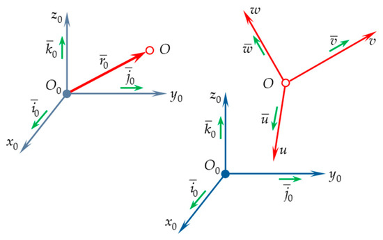 Equations (5) and (8), presented above, define the position and orientation of a right-handed reference system. These mathematical expressions will be generalized for the case of a rigid body. According to [5,11,17], a rigid body is composed of an infinite number of material particles and an infinite number of geometric axes, parallel and perpendicular to each other, characterized by a continuous distribution throughout the entire volume of the rigid body. The rigid body also includes an infinite number of sets consisting of three orthogonal geometric planes, continuously distributed throughout its volume. Geometrically, to define a right-handed reference system with its origin at an arbitrary point belonging to the rigid body, it is sufficient to select a single set composed of three orthogonal planes. According to Equation (4) and Figure 2, this reference system is denoted as . The reference system is attached to the rigid body. Equations (5) and (8) define the position and orientation of this system.
