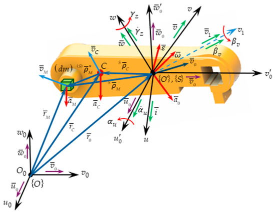 Based on the authors’ research, this section will present a series of new formulations about advanced kinematic concepts. A rigid body (S) represented in Figure 2 and undergoing general motion is considered. By applying the first-order absolute derivative to the parametric motion equations, we obtain the following: