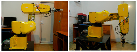 In Equations (141)–(146) the symbols denote the masses of the analyzed kinetic link of the Fanuc LR Mate 100 iB industrial robot (Figure 6).