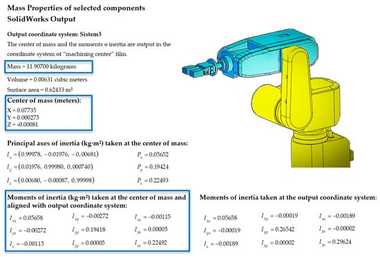 In the context of this paper, the mass properties served as input data for the analytical formulation of the acceleration energies and driving torques of a higher order. The integration of these physical characteristics ensured consistency between the theoretical model and the real mechanical structure of the robot. By assigning real values to these quantities, the dynamic behavior of each kinematic link could be evaluated, which is essential for the validation of the proposed mathematical model.