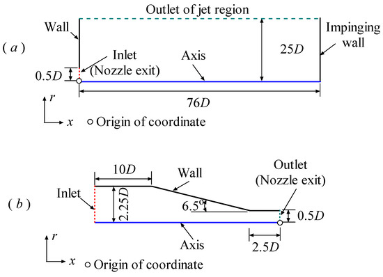 The schematic depiction of the model geometry of the impinging jet and relevant boundary conditions: (a) jet region; (b) nozzle.