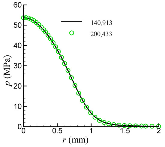 A grid sensitivity analysis was conducted by developing two distinct computational mesh configurations. The second mesh configuration was based on the first one, and the 50 layers of grids adjacent to the flat plate were refined through reducing the grid size by half. The grid numbers of the two configurations are 140,913 and 200,433, respectively. The predicted impact pressure distribution on the flat plate is presented in Figure 2. As can be seen, the difference between the results for the two mesh configurations is indistinguishable, indicating that the simulation results are no longer dependent on the number of grids. Consequently, the first mesh configuration was adopted throughout subsequent simulations to optimize computational efficiency.