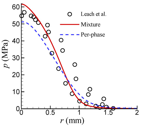 It is clearly observed that, in the region near the stagnation point, the mixture turbulence model methodology overpredicts the pressure, whereas the per-phase turbulence model methodology underpredicts it. Overall, the result of the mixture turbulence model methodology is slightly superior. Additionally, considering the simplicity and ease of use of the method itself, the mixture turbulence model methodology was chosen in this work.