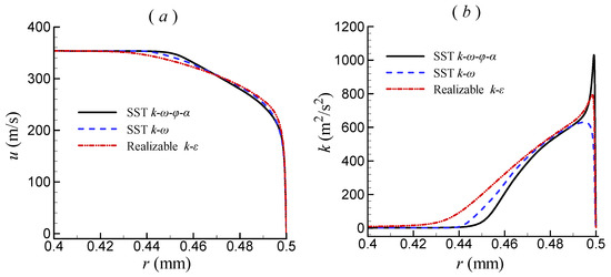 Figure 4 shows the velocity and turbulent kinetic energy profiles at the nozzle exit predicted by different turbulence models. In most areas near the axis (r < 0.4 mm), the results obtained by the three turbulence models are very close. There are some differences in the area near the nozzle wall. Overall, the differences among the velocities obtained by the three turbulence models are not too significant, but the differences in turbulence kinetic energy are quite noticeable. The SST k-ω-φ-α model predicted the largest peak value of the turbulence kinetic energy, while the SST k-ω model predicted the lowest.