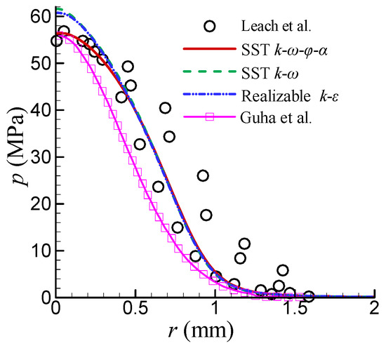 The distributions of pressure on the flat plate simulated by different turbulence models are shown in Figure 5. It is observed that the SST k-ω-φ-α model yields good stagnation pressure compared with the experiments of Leach et al. [9]. The difference between the SST k-ω model and the realizable k-ε model is slight. They overpredicted the pressure near the stagnation point by about 10%. In areas with r > 0.5 mm, the results from the three turbulence models are almost indistinguishable. As a comparison, the pressure distribution on the flat plate from the numerical simulation of Guha et al. [12] is also depicted. Obviously, it was underpredicted throughout.