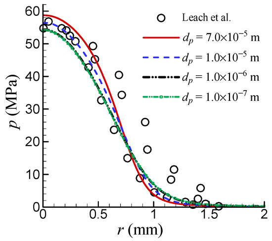 The influence of different diameters of air bubbles was investigated, and the results are shown in Figure 7. As observed, the pressure near the stagnation point becomes higher when the diameter of the air bubbles becomes larger. When the diameter of the bubbles is below a certain size (such as 10−6 m), the pressure almost does not change with the size of the bubble. The reason for this may be that when the diameter of the bubbles is below a threshold, the drag force is so small that it makes almost no contribution to the transfer of momentum. A diameter of 10−5 m yields good results compared to the experiment. It should be pointed out that the largest diameter of bubbles simulated in the present work is 7 × 10−5 m because the computation becomes unstable when the bubble diameter is larger.
