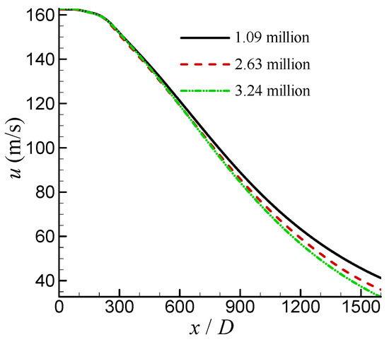 The problem of a free high-pressure water jet was also simulated. The jet issues from a conical nozzle, then flows into the air and sprays over long distances. The computational model was constructed based on the experiments conducted by Rajaratnam et al. [7]. Considering the axisymmetric characteristics both in terms of geometry and physics, it was simplified to an axisymmetric model. A schematic depiction of the model geometry and relevant boundary conditions is shown in Figure 9a. The enlarged view of the nozzle is shown in Figure 9b. Here, the diameter of the nozzle exit D = 2 mm, the length of the main computational domain along the jet stream-wise is 1600D, and the lateral size is 50D. The mean velocity at the nozzle exit is 159 m/s. Other related computational settings are consistent with the reference case. To verify the independence of the simulation results from the grid, three grid configurations were designed through refining cells in the jet region and near the wall boundaries. Based on the different grid configurations, the velocities along the axis computed by the SST k-ω-φ-α model are shown in Figure 10. It can be seen that there is a small difference among the results. In the end, the grid configuration with a grid number of 2.63 million was chosen.