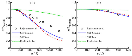 Simulations using three turbulence models, namely the SST k-ω-φ-α model, the SST k-ω model, and the realizable k-ε model, were performed. Figure 11 compares the simulated velocity (normalized by the mean velocity at the nozzle exit, Unozzle = 159 m/s) from different turbulence models along the axis. Apparently, the velocities predicted by all three turbulence models agree well with the experimental data obtained by Rajaratnam et al. [7] in the region of x < 200D. Moreover, the velocities maintain their value at the nozzle exit, and there is not much difference in the results of the three turbulence models in this region.