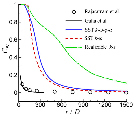 Figure 12 shows the simulated volume fraction of water (Cw) along the axis by different turbulence models. In the experiments of Rajaratnam et al. [8], the volume fraction of water decreased rapidly after the jet left the nozzle, indicating that a large amount of air quickly entered the core area of the jet. The SST k-ω-φ-α model and the SST k-ω model similarly obtained a rapidly decreasing volume fraction of water. The difference is that the length of the jet potential core obtained by these two turbulence models is much larger than the experimental results. Figure 12 also includes the numerical results of Guha et al. [10,12]. They obtained a volume fraction of water consistent with the experiments by introducing additional source terms into the momentum equation. However, as shown in Figure 5, this method reduces the simulation accuracy of the impact pressure distribution for an impinging jet with a short stand-off distance. The realizable k-ε model obtained a different behavior; i.e., the simulated water volume fraction decreased much more slowly with increasing distance.