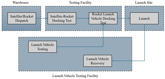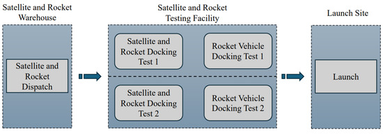 In Figure 2, an emergency maneuver launch mission, the launch system typically consists of launch vehicles, rockets, satellites, various facilities (warehouses), and launch sites. Rockets and satellites are typically stored in the rocket and satellite storage facilities, while launch vehicles are kept in the launch vehicle storage buildings. Before the rocket launch, the satellite–rocket docking test, launch vehicle test, and rocket–vehicle docking test must be completed. Finally, the launch vehicle transports the satellite–rocket assembly to the launch site for launch.