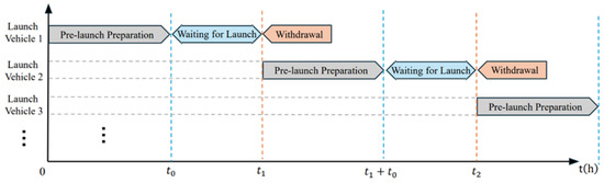 The launch site consists of a standby area and a launch pad, which are located in close proximity. Prior to launch, the launch vehicle must complete vertical positioning, parameter configuration, and self-check procedures. Once these preparations are finalized, the vehicle may remain on the launch pad in a standby state for no more than 30 min. Rocket ignition and launch are treated as instantaneous events. After launch, the launch vehicle must immediately withdraw; vehicles that have not launched are not permitted to withdraw from the launch pad. In Figure 3 when multiple launch vehicles arrive simultaneously, launches must be conducted in sequence: the following vehicle must wait in the standby area until the preceding vehicle has completed its launch. Only after the prior vehicle has launched may the next vehicle enter the launch pad for final preparations. Once pre-launch procedures are completed, the launch cannot be aborted for direct withdrawal.