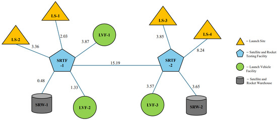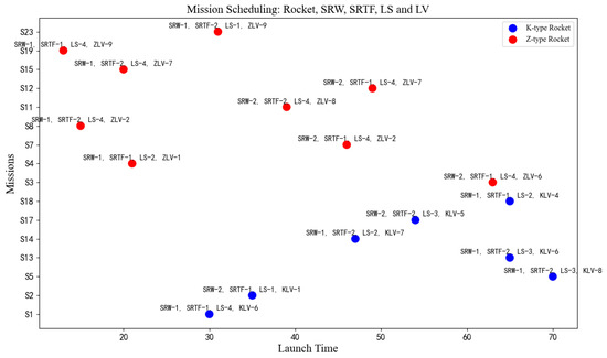 - Resource Allocation Constraints:For each mission , denotes whether mission m is assigned to warehouse w; denotes whether mission m is assigned to the satellite–rocket warehouse a; denotes whether mission m is assigned to launch vehicle v; denotes whether mission m is assigned to launch site l.