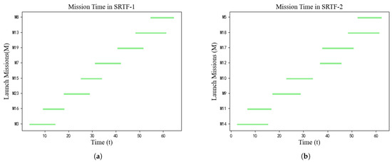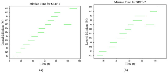 Figure 5 illustrates the mission time interval distributions for the two satellite–rocket test facilities (SRTF-1 and SRTF-2), which directly reflect the recovery and reusability time data of the launch vehicles presented in Table 3.