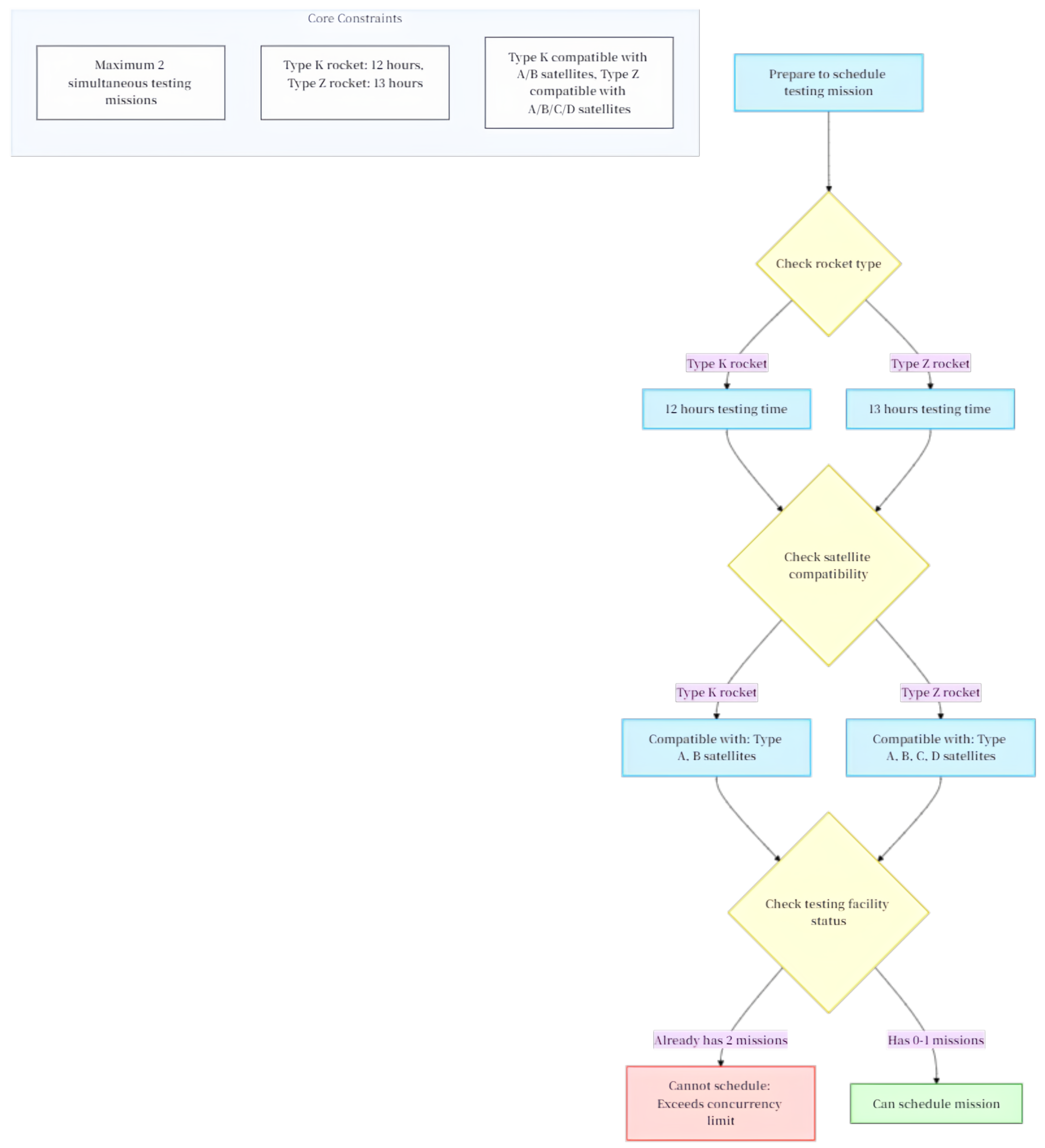- Assume that, in the absence of mission conflicts, the satellite, rocket, and launch vehicle can immediately undergo testing upon arrival at the satellite and rocket testing facility;