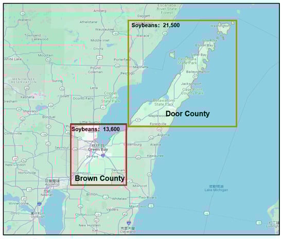 Crop planting area estimation aims to predict the area of a specific crop in a given region. For example, Door County has a soybean planting area of 21,500 acres, and Brown County has a soybean planting area of 13,600 acres, estimated from remote sensing data, shown in Figure 1.