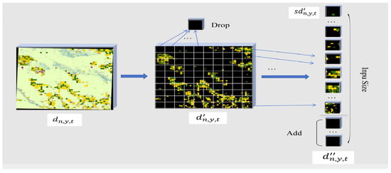 The multi-subimage technique primarily involves masking, cropping, deletion, and padding. As previously discussed in Section 3.3 on the time-series-based pixel inference method, the historical CDL dataset  is converted into . In the masking of the multi-subimages method, the crop sequence historical CDL data  are tailored by the cultivated land mask, which enable the reduction in irrelative data during the model training. After that, the non-cultivated land pixels, such as building, lakes, roads, and forests in the historical CDL data , will be assigned with the value “zero”; the other pixels of target type in the cultivated land area are also assigned with the ’others’ class, such as being labeled ‘3’. Then, the data labeled  are denoted by (5).