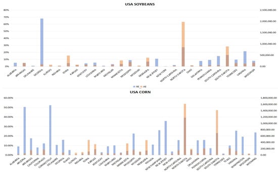 Comparative analysis of prediction results for soybean and corn. The upper panel illustrates the predicted results for soybean cultivation, presenting the predictions for the cultivated areas in various states in 2021, and the AE is plotted as an orange bar, while the RE is depicted as a blue bar chart. Similarly, the lower panel describes the predictions for corn.