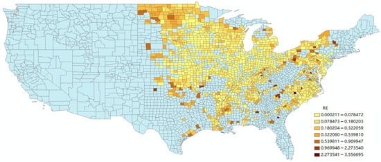 RE of 2021 soybean planting area in the United States (part) compared with the data published by USDA. The RE increases as the color gets darker from yellow to brown, shown in the legend at the bottom right. The blue area is the area with missing data at the county level. There are two reasons for the missing: one is the lack of planting situation, and the other is the combination of statistics with neighboring counties in the statistical process. These two cases are not distinguished.