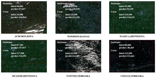 Six regions were randomly selected for the area estimation task of corn and soybean; the prediction ability of the model is visualized in Figure 6. It is an intuitive demonstration of the difficulty of the problem to be solved in this paper, especially between the predicted results, and the label of soybean in Mcleod Minnesota is 227 acres only.