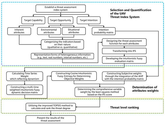 In actual combat, assessing the threat level of targets involves integrating various factors. While algorithms excel at rapidly processing data, the experience and judgment of commanders remain invaluable and irreplaceable. To address the “human-in-the-loop” requirement in military decision making, it is essential to combine algorithms with the knowledge and expertise of military professionals. In a battlefield environment characterized by multi-attribute considerations, high dynamics, and intense adversarial interactions, multi-attribute decision making theory stands out compared to other threat assessment methods. It demonstrates core advantages such as exceptional battlefield adaptability, effective human–machine collaboration, and flexible scalability. This approach addresses key deficiencies in other methods for assessing the threats posed by UAVs on the battlefield, making it a prominent focus in threat assessment research. Over the past 20 years, multi-attribute decision making methods have accounted for 44% of solutions to target threat assessment problems [9].